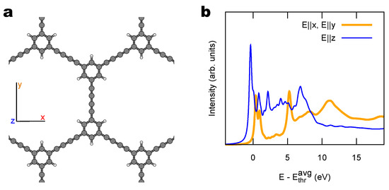 While holding on to the need of stabilizing sp chains by aromatic units anchoring to the substrate, the investigation can be extended to non-linear polymeric arrangements of the monomers as, e.g., obtained with carbon-based scaffolds [63]. As an example, consider the 2D network formed by the de-Bromination and subsequent de-metalation of 1,3,5-tris(bromoethynyl)benzene (tBEP) precursors deposited on Au(111) [30]. This sequence of reactions forms a honeycomb lattice where phenyl rings are connected by C segments arranged at 120 from each other, as illustrated in Figure 8a. Given the relatively limited role of the substrate in the electronic structure of the polymer discussed in Section 2.2, and the necessarily larger unit cell, here we only report simulations of the free-standing case. The structure is optimized by minimizing the DFT total energy. Figure 8b shows the computed NEXAFS spectrum for this system. Very much as in the linear bBEBP polymer where the LUMO + 1 states of Figure 4 are highly localized on the C units and consequently appear as flat bands in Figure 3e, also this 2D compound has similar C-localized empty states derived from in-plane C 2p orbitals, which produce a similar polarization-dependent NEXAFS signal, with low-energy resonances occurring even for in-plane polarization. Few differences are worth pointing out for this case: here the x and y directions are equivalent due to hexagonal symmetry; the first peak in the z spectrum is narrower than in bBEBP/Au(111) because of the simpler aromatic ligand (as well as due to the model neglecting substrate hybridization); the relative intensity of the in-plane features increases, since the number of sp atoms is now the same as that of sp ones. Especially this last aspect is interesting as it would make sp easier to detect in experiments.