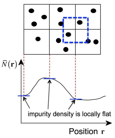 This implies that the long-wavelength limit of impurity density is equivalent to taking account of only the zero-Fourier component of the microscopic impurity density given by Equation (4). In other words, when impurity density is expressed as a smooth continuous function of position, the impurity density is considered to be locally flat, so that the electrostatic potential induced by the impurities is also locally flat because the number of impurities included in the region is virtually regarded as constant. This situation is schematically shown in Figure 1.