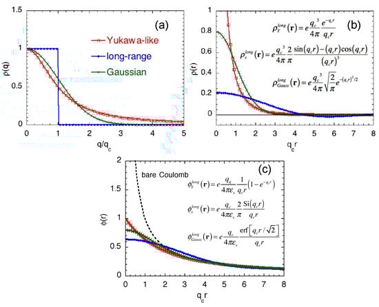 It is very interesting to compare Equations (14) and (15) with those we have previously proposed to extract the long-range portion of the impurity Coulomb potential [7,8,9,25]. Figure 2 shows the charge distributions (in both - and -spaces) and the (long-range) potentials of the three different expressions; the Yukawa-like expression given by Equation (15), the long-range expression given in [7,8,9], and the Gaussian expression in [25] employed as an alternative model to eliminate artificial oscillations showing up in the charge density by the previous long-range model. Explicit formulas of all three models are also shown in the inset of Figure 2. It is clear that the only difference among the models is how the short-range part of the Coulomb potential is eliminated: the short-range part is sharply cut at in the previous long-range model, whereas the present and Gaussian models gradually eliminate the short-range part. As a result, the long-range potentials are slightly different near the origin. Yet, all models properly approach the bare Coulomb potential as the distance from the impurity becomes much greater than .