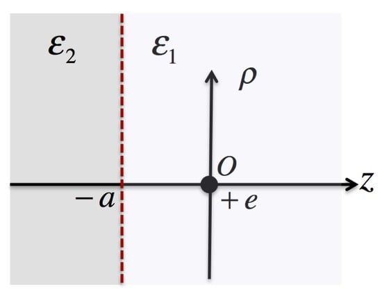 Let us consider two different materials with the relative permittivities and that are separated by an infinite plane interface. An ionized impurity is then embedded in the material with at a distance a (>0) from the interface. The cylindrical coordinates whose origin coincides with the position of the impurity are employed, as shown in Figure 3.