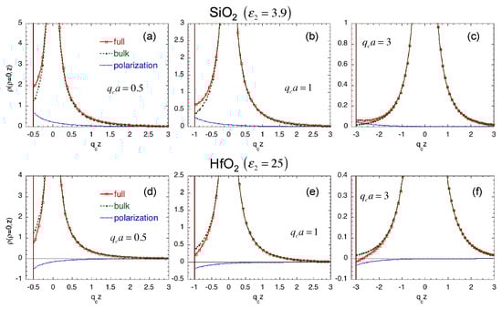 Charge distributions (denoted by “full” with red line) along the z-axis () induced by the impurity at the origin for two different dielectrics; SiO with (a–c) and HfO with (d–f). The distances from the interface are 0.5 (a,d), 1 (b,e), and 3 (c,f). The semiconductor material in is assumed to be Si (). The charge distributions obtained from the first term (denoted by “bulk” with the green line) and the second term (denoted by “polarization” with the blue line) in the integrand of Equation (21) are also shown.