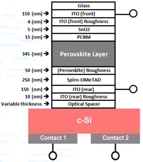 One way to increase the efficiency of crystalline Si (cSi) cells is to make tandem solar cells in which a top cell with a higher bandgap than silicon absorbs the higher energy photons. Calculations show that tandem device architecture employing cSi in combination with a wide-bandgap absorber can potentially achieve PCE above 30% [,,,]. This is due to the reduction in the thermalization loss of charge carriers generated from the high energy photons by the wide bandgap absorber top cell [,]. In general, there are two fabrication configurations in tandem solar cells: two-terminal and four-terminal configurations. In the two-terminal configuration, the top solar cell is processed directly on the bottom solar cell, and therefore, the top and bottom cells are electrically connected in series [,,,]. Hence, the current within both top and bottom cells must be equal, a constraint known as current matching []. This strict requirement of current matching constrains the bandgaps of both top and bottom cells, limits the design flexibility, and makes efficiency improvement more difficult. When compared with the two-terminal structure, the four-terminal mechanically-stacked tandem configuration has several advantages. The four-terminal mechanically stacked architecture relaxes the performance constraints, such as current-density matching and the need for tunnel junctions while enabling the optimization of the top and bottom cells separately [,,,]. In this configuration, the top and bottom cells are electrically isolated from each other, and therefore the output power is extracted separately and enables independent optimization of the solar cell fabrication. Current matching between the top and bottom strings of cells can be achieved at the module level by adjusting the relative top and bottom cell sizes. However, to fully benefit from the four-terminal perovskite/Si tandem cell configuration, choosing the optimum optical spacer and minimizing the parasitic absorption of both the front and rear transparent conductive oxides is crucial for the viability of this tandem configuration [].