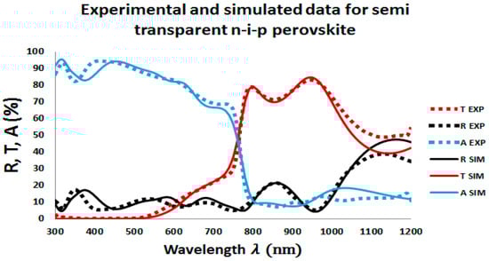First, in order to calibrate and underline the accuracy of our optical simulations, Reflectance (R), Transmittance (T), and Absorptance (A) of a semi-transparent perovskite-based sub cell with MAPbI3 as absorber material in an architecture of the perovskite cell, as depicted in Figure 1, were measured and compared with simulations. Excellent agreement with experimental data can be seen in Figure 2, which confirms the accuracy of our simulation. However, the small offsets for long wavelengths in our transmission and reflection plots between experimental and simulation data are due to the small absorption or scattering effects in the substrate.