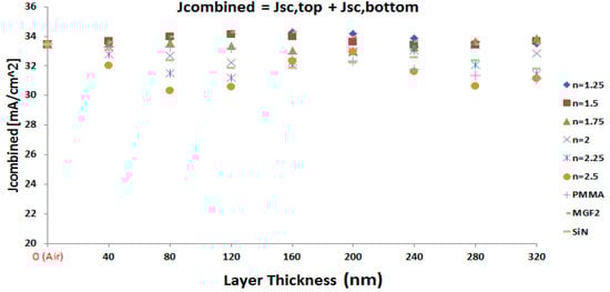 With the accuracy of the optical simulation method validated, the full stack of the four-terminal perovskite/cSi tandem is considered with MAPbI3 as an active layer for the perovskite sub-cell, the internal and external losses are calculated such that the short circuit currents for both the top and bottom cell can be determined. Thereby, the optical properties (n value) and thickness of the spacer layer is varied to find the overall combined short circuit current as the sum of the photo-currents generated in both sub-cells. In our optical simulations, the refractive index n of the spacer layer is varied over a broad range from n = 1.25 to n = 2.5, since simulation gives us the freedom to choose any arbitrary value for n. In order to address the real working device, as examples, the optical data from common optical spacer materials, like Silicon Nitride (SiN; n(SiN) = 2.0458), Magnesium Floride (MgF2; n(MgF2) = 1.3777), and polymethylmetacrylate (PMMA; n(PMMA) = 1.4906) are used as well in the simulations. In general, optical mediums, such as SiN and MgF2, can be coated by sputtering [,], thermal evaporation [,,], and atomic layer deposition (ALD) [] while polymer-based spacers such as Polymethylmethacrylate (PMAA) can be coated by solutions using different methods, such as spin, blade, slot die, and spray coating []. The spacer thickness is varied from 0 nm up to 320 nm, in steps of 40 nm. The resulting overall combined short circuit current is represented in Figure 3 for each of these combinations of n value and layer thickness.