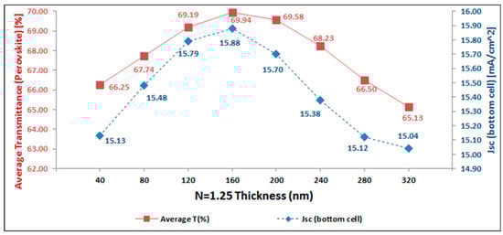 Finally, as it is clear from Figure 3, the total photo-current will be maximum for the simulated four-terminal tandem device, when an optical spacer is used with n = 1.25 and a thickness of 160 nm. Further analysis of the simulation data, as depicted in Figure 4, clarifies that at these conditions the average optical transmittance of the perovskite-based sub-cell is reaching a maximum, just below 70%. This in turn results in a maximum value for the short-circuit current of the IBC cSi bottom sub-cell, close to 16 mA/cm². This is an excellent illustration of the importance of the light management by the optical spacer layer to not only maximize the current generation in the top cell, but also in maximizing the light in coupling into the bottom cell to simultaneously have high current generation in that sub-cell.