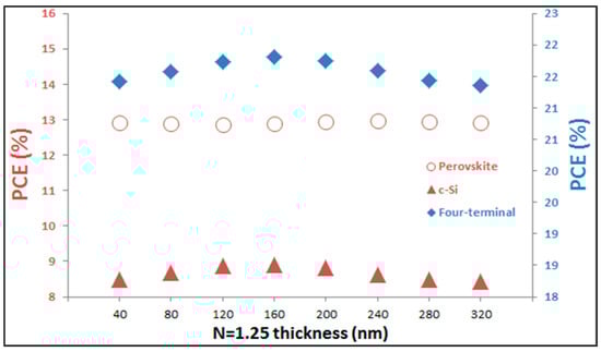 This observation is further validated in Figure 5, where the PCE values of both sub-cells as well as the full four-terminal tandem are calculated for different thickness of the optical spacer layer, with n = 1.25. We assume open-circuit voltage (VOC) equal to 0.97 Volt and Fill Factor (FF) equal to 72% as taken from reference [] as an example (when MAPbI3 is used as active layer of perovskite based sub-cell) and use our simulated short-circuit currents (JSC) to calculate the efficiencies of sub-cell and compare them with the four-terminal tandem device. The data clearly indicate that, while there is minor variation in PCE for the perovskite based sub-cell, the variation for the cSi sub-cell follows the Jsc trend, as shown in Figure 4. It is this variation of Jsc that subsequently results in the maximum overall PCE value of the four-terminal tandem device, close to 22%.