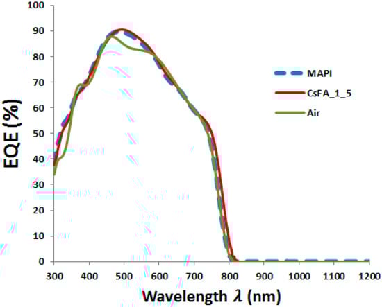 Simulated external quantum efficiency (EQE) solar cells based on MAPbI3 and CsFAPbIBr perovskites.