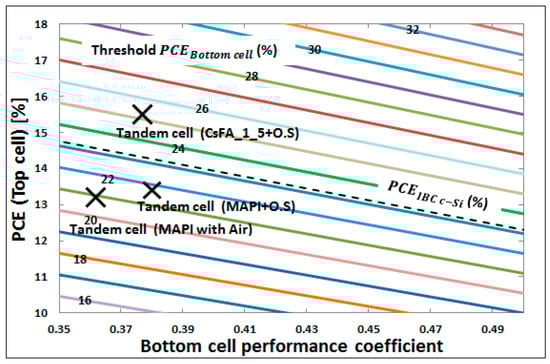 Thus, this study clarifies two main pathways to identify four-terminal perovskite/cSi tandem devices that can outperform the stand-alone cSi cell, as depicted in Figure 7. Here, in order to determine the factor by which the Si cell PCE drops when in tandem configuration when compared to stand-alone, the bottom cell performance coefficient (γ) is calculated. This coefficient is influenced by the sub-bandgap transparency of the top solar cell, and it is calculated as the ratio of the PCE of the bottom solar cell in four-terminal configuration to its stand-alone PCE, see Equation (5).