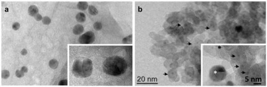 TEM images of freshly synthesized and reconstituted Fe@Au nanoparticles. Compared to the as-synthesized nanoparticles (a), the reconstituted nanoparticles (b) lose their homogeneity and show a more uneven electron density. The composition was analyzed by EDXS as shown in Table 1. The dark clump, marked by the white star, is Au and the major composition of low-electron-density aggregates, marked by black star, is Fe and O (i.e., iron oxide; see Supplementary Materials, Table S1). The black arrows indicate pale ring-like structures. The magnification and the scale of figure (a) is identical to figure (b).