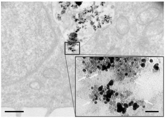 TEM images of Fe@Au within cells, internalized by human oral cancer cells. The structure of reconstituted Fe@Au internalized by human oral cancer cells is disrupted and loses the core–shell structure of as-synthesized Fe@Au. The morphology of internalized Fe@Au is similar to the reconstituted Fe@Au but the pale, ring-like structures of Figure 1b are not apparent. Instead, donuts-like rings are evident and marked by white arrows. The left scale bar is 500 nm and the right scale bar of the inserted figure is 50 nm.