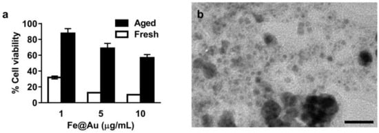 Our previous study briefly reported that the IC50 of Fe@Au keeps increasing with storage time after synthesis, corresponding to a decrease in cytotoxicity with storage [19]. Once the IC50 of Fe@Au in oral cancer cells, OECM1, rose higher than 10 µg/mL, we considered the Fe@Au batch was aged (denoted as “aged Fe@Au”) and we no longer used those nanoparticles for further experiments (Figure 3a, p < 0.0001, ANOVA). Understanding and therefore being able to minimize, this ageing process is essential if these nanoparticles are to be used for future medical applications.