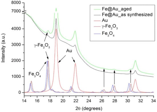 To that end, we characterized aged Fe@Au nanoparticles to investigate the mechanism behind the aging and the corresponding decrease in cytotoxicity. Differences are evident from the TEM images of aged Fe@Au (Figure 3b) when compared with freshly synthesized nanoparticles (Figure 1a); in particular the aged Fe@Au sample contains large clumps along with small debris of low electron-density. We analyzed the phases and average particle (crystallite) sizes of the fresh and the aged Fe@Au by XRD (Figure 4). The major XRD peaks of fresh and aged Fe@Au correspond to the diffraction peaks for elemental Fe and Au. Both the reconstituted and the aged Fe@Au show minor peaks of γ-Fe2O3 (rather than Fe3O4), although clearly the area of the γ-Fe2O3 diffraction peaks is larger in the aged nanoparticles, consistent with increased oxidation of the iron-rich cores. Given that the major diffraction peaks for elemental Fe and Au tend to overlap [26], we synthesized and scanned pure Fe nanoparticles for comparison; the diffraction pattern for these Fe nanoparticles is identical with the standard diffraction file of bulk Fe (see Supplementary Materials, Figure S2). The XRD diffraction peak at 2θ = 17.698 is corresponded to (111) crystal face reflection of γ-Fe2O3 (see Figure 4). The full width at half maximum (FWHM) are 0.805 and 0.361 degree in 2θ by peak profile fitting in Lorentzian function for freshly reconstituted and the aged Fe@Au respectively. The calculation of particle size was based on the Scherrer’s equation [27,28,29],
