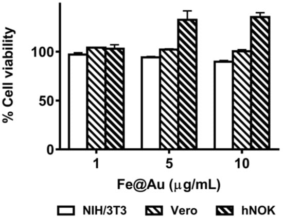 The aged Fe@Au shows great biocompatibility in three different cultured lines of healthy or benign cells. The cell lines, NIH/3T3, Vero and hNOK, were exposed to aged Fe@Au for 48 h and the cell viability was assessed by WST-1 assay. Aged Fe@Au is highly biocompatible in these cells.