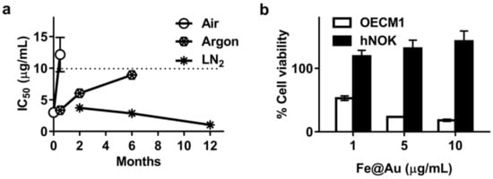 Optimizing the storage condition of Fe@Au to preserve the anti-cancer activity. (a) It shows the viability of the oral cancer cell line, OECM1, treated with Fe@Au stored under different conditions—including exposure to air, storage under argon and storage under liquid nitrogen—at different time points. The cell viability was assessed by the WST-1 test after 48 h of treatment. The IC50 dosages are calculated according to the cell viability results; (b) Fe@Au nanoparticles stored under liquid nitrogen for 12 months were used to treat oral cancer cells, OECM1 and paired healthy cells, hNOK, for 48 h. The cell viability was assessed with the WST-1 assay.