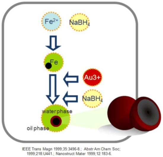 The core–shell structures were synthesized by using a sequential synthesis technique within reverse micelles in a cetyltrimethylammonium bromide/N-butanol/water system [15]. Briefly, all reverse micelle solutions were prepared with 1.9 M cetyltrimethylammonium bromide as the surfactant and isooctane as the oil phase, under argon gas. In the first step, two micellar solutions were combined: 0.2 M FeSO4 (aq) and 0.5 M NaBH4 (aq), both solutions with a molar ratio (ω) of water to surfactant of 2.54, using a magnetic stirrer at a speed of 260 rpm for 30 min to form the iron cores. In the second step, a coating of gold was applied onto the iron core by adding 0.05 M HAuCl4 and 0.8 M NaBH4 reverse micellar solutions (ω = 3.8) after completion of the first reaction.