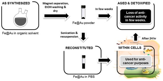 Despite the extensive potential biomedical applications, iron nanoparticles suffer from oxidation and instability. The iron core-gold shell nanoparticles, denoted as Fe@Au, were initially designed two decades ago by Zhou et al. [15]. Briefly, Fe@Au are prepared inside the reverse micelles through the reduction of metal salts using sodium borohydride (Scheme 1). Such core-shell structure is proposed to take advantage of magnetic susceptibility of zero valent iron cores and the passivating properties of the gold coatings, which delays the oxidation of the iron cores [16]. In addition, Fe@Au nanoparticles has also been proposed as imaging probes for magnetic resonance imaging [17], X-ray computed tomography [17,18] and so forth. Previously, we reported that freshly prepared nanoparticles with an iron core and gold shell (denoted “Fe@Au”) have potent anti-cancer properties, selectively suppressing the growth of various cancer cells, while sparing healthy cells. We have demonstrated this effect in 12 normal and cancer cell lines, including primary cultured cells and within relevant in vivo (animal model) settings [19,20]. Typically, the Fe@Au nanoparticles have an average diameter of 10 nm with a shell of face-centered-cubic Au and body-centered cubic Fe(0), without traces of iron oxide [19,21]. We have demonstrated that Fe@Au triggers mitochondria-mediated autophagy and halts cancer cell growth, in oral cancer cells [21] and provokes an alternative cytotoxic pathway in colorectal cancer cells [20]. Given our evidence that the cytotoxicity of Fe@Au is linked to the redox activity of the Fe(0), it is not surprising that cytotoxicity decreases with the progression of oxidation of iron in the particles, a process we termed “ageing” [19]. This phenomenon also occurs when storing freshly prepared Fe@Au particles over time. Clearly then the structure–cytotoxicity relationship of Fe@Au at different stages (Scheme 2) and the optimal storage condition are vital issues for practical therapeutic application in the near future.