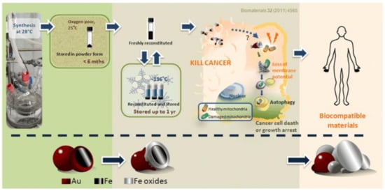 - Wu, Y.N.; Yang, L.X.; Shi, X.Y.; Li, I.C.; Biazik, J.M.; Ratinac, K.R.; Chen, D.H.; Thordarson, P.; Shieh, D.B.; Braet, F. The selective growth inhibition of oral cancer by iron core-gold shell nanoparticles through mitochondria-mediated autophagy. Biomaterials 2011, 32, 4565–4573. [Google Scholar] [CrossRef]