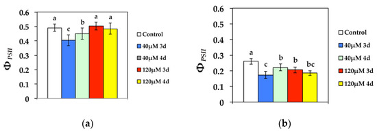 Changes in the quantum efficiency of PSII photochemistry (ΦPSII) in N. caerulescens measured (a) at 300 μmol photons m−2 s−1 or (b) 1000 μmol photons m−2 s−1. N. caerulescens plants were grown at 0 (control), 40, or 120 μM Cd2+ for 3 and 4 days.