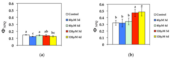 Changes in the quantum yield for dissipation by down regulation in PSII (regulated heat dissipation, a loss process serving for protection) (ΦNPQ) measured at (a) 300 μmol photons m−2 s−1 or (b) 1000 μmol photons m−2 s−1. N. caerulescens plants were grown at 0 (control), 40, or 120 μM Cd2+ for 3 and 4 days.