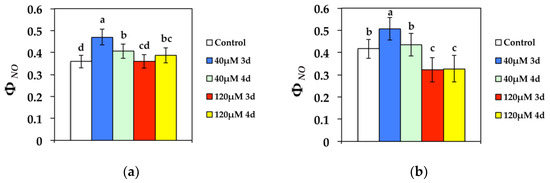 Changes in the quantum yield of non-regulated energy dissipated in PSII (non-regulated heat dissipation, a loss process due to PSII inactivity) (ΦNO) measured at (a) 300 μmol photons m−2 s−1 or (b) 1000 μmol photons m−2 s−1. N. caerulescens plants were grown at 0 (control), 40, or 120 μM Cd2+ for 3 and 4 days.