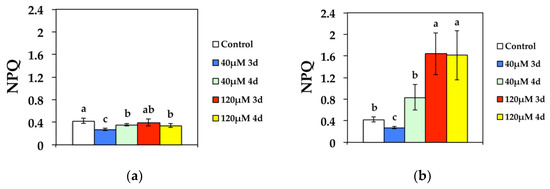Non-photochemical quenching (NPQ) that reflects heat dissipation of excitation energy, decreased significantly compared to the control after 3 d at 40 μM Cd at GL, while it improved during the 4 d (Figure 5a). Exposure to 120 μM Cd resulted in decreased NPQ at GL compared to controls during the 4 d (Figure 5a). At HL, NPQ decreased significantly compared to the control after 3 d exposure to 40 μM Cd, and increased to control values during the 4 d, while after exposure to 120 μM Cd increased significantly compared to the controls (Figure 5b).