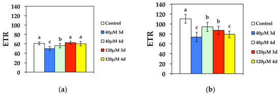 The electron transport rate (ETR), at both GL and HL intensity, decreased significantly compared to the control after 3 d at 40 μM Cd, while it improved during the 4 d (Figure 6). However, ETR increased to control values after 3 d exposure to 120 μM Cd at GL and stabilized to control values after 4 d exposure (Figure 6a). High light exposure to 120 μM Cd resulted in decreased ETR compared to the controls (Figure 6b).