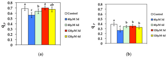 The redox state of QA (qP) that is a measure of the fraction of open PSII reaction centers, at both GL and HL intensity, decreased significantly compared to the control after 3 d at 40 μM Cd, while it improved during the 4 d (Figure 7). However, qP increased to control values after 3 d exposure to 120 μM Cd at GL and stabilized to control values after 4 d exposure (Figure 7a). High light exposure to 120 μM Cd resulted in a more reduced redox state of QA compared to controls, i.e., a lower fraction of open PSII reaction centers (Figure 7b).