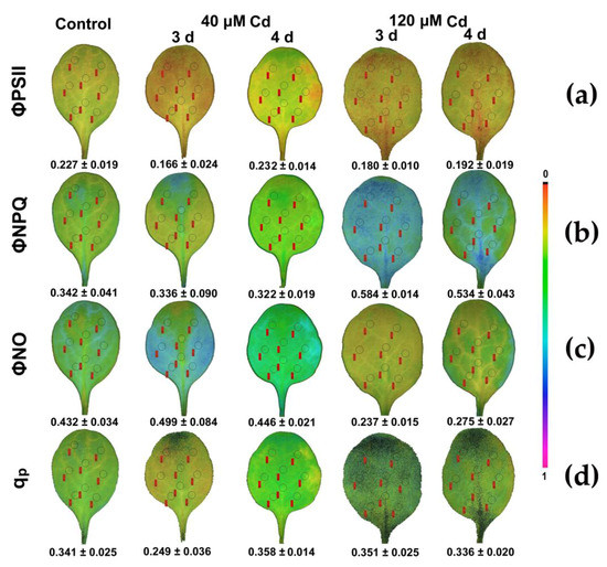 Exposure of N. caerulescens to HL increased the spatiotemporal leaf heterogeneity (Figure 9) and the plants suffered more from Cd toxicity during the 3 d of exposure to 40 μM Cd, but they recovered during the 4 d. However, exposure to 120 μM Cd at HL revealed mild effects. This was realized by an increase in ΦNPQ (Figure 9b) that down-regulated PSII quantum yield (ΦPSII) (Figure 9a) and decreased the quantum yield of non-regulated energy loss in PSII (ΦNO) (Figure 9c).