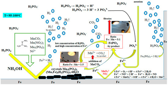 Reactions occurring between the phosphatizing solution and metal surface are shown in Figure 1. At the beginning of the process, a dissociation of H3PO4 into H2PO4− ion between pH 1 to 3 takes place (Equation (3)) [30].