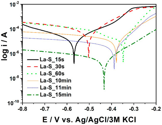 The duration of the phosphating process plays a significant role. Over time, the formation of manganese phosphate crystals increases. This paper investigates the effect that phosphating time has on the formation of the previously mentioned crystals for 14 samples with a time range from 15 s to 900 s, see the sixth stage from Table 2. A total of 14 doubled samples were prepared in the same way depending on the time of immersion in the phosphate bath and were subjected to SEM and XRD tests as well as electrochemical tests. On the surface of a sample submerged for a shorter time (15 s), several phases, including Mn2.5(HPO4)(PO4)(H2O)2, were detected. The observed phases are purely crystallized and hence the obtained XRD pattern is of low quality and no quantitative analysis is possible. The lower pattern presents XRD data for a sample submerged for a longer time (180 s) and shows that the sample is coated by Mn2.5(HPO4)(PO4)(H2O)2 phase with an estimated crystallite size of approximately 50 nm. The samples differed only with the mass of the phosphate coating. For sample La-S_15s to La-S_900s the phosphating bath was made in accordance with Table 2. The polarization curves obtained for the samples immersed for different times in the bath containing phosphate are shown in Figure 2. On the basis of the registered curves, the values of corrosion potential, current density, and corrosion rates were determined and listed in Table 3. Figure 3 presents XRD patterns for two selected samples that were phosphated for various times.