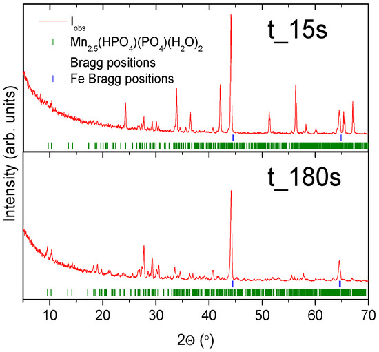 XRD patterns for the samples t_15s and t_180s. Solid red lines are the measured patterns, the green tickmarks correspond to the Mn2.5(HPO4)(PO4)(H2O)2 phase, and the blue tickmarks correspond to iron.