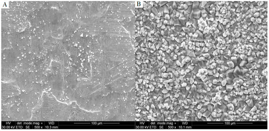 SEM images and EDX analysis of obtained coatings: (A) Without the passivation process; and (B) after the passivation process.