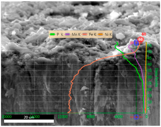 Figure 5 presents a cross-sectional area of sample B. A highly corrugated sample surface is seen on the top, whereas a relatively homogeneous bulk is seen on the bottom of the figure. The elemental analysis of the cross-section is represented by four solid lines that show the relative concentration of P, Mn, Fe, and Ni. On the surface P, Mn, and Fe are present and detailed analysis reveals that a relative atomic concentration is 50:37:13 (P:Mn:Fe). The concentration of Fe rapidly increases with distance from the surface. There is no clear border between the surface and a bulk material, but 15 μm inside the sample we found twice the amount of Fe compared to the total amount Mn and P together and at a distance of 30 μm from the surface with a relative atomic concentration is 2:1:97 (P:Mn:Fe). Nickel was not found in this sample.