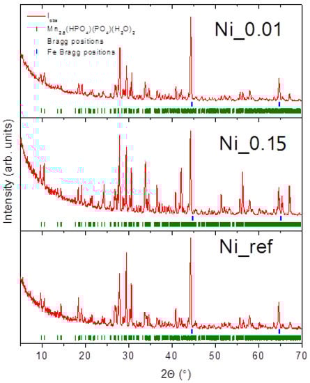XRD patterns for the samples Ni_0.01, Ni_0.15, and Ni_ref. Solid red lines are measured patterns, the green tickmarks correspond to the Mn2.5(HPO4)(PO4)(H2O)2 phase, and the blue tickmarks correspond to iron.