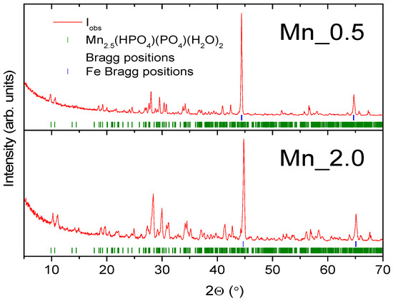 XRD patterns for the samples Mn_0.5 and Mn_2.0. Solid red lines are measured patterns, the green tickmarks correspond to Mn2.5(HPO4)(PO4)(H2O)2 phase, and the blue tickmarks correspond to iron.