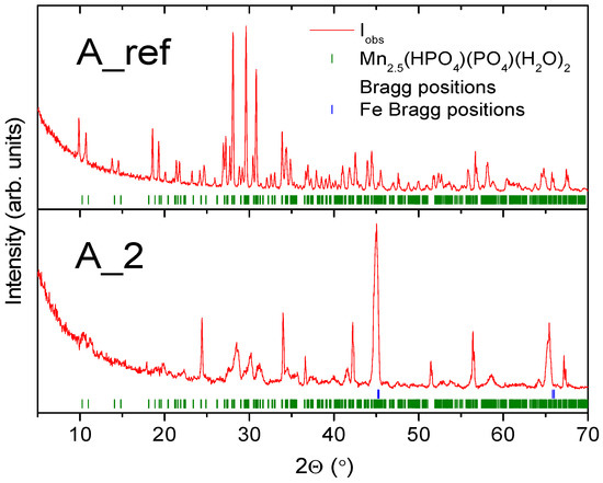 XRD patterns for the A_ref and A_2 samples. Solid red lines are measured patterns, the green tickmarks correspond to Mn2.5(HPO4)(PO4)(H2O)2 phase, and the blue tickmarks correspond to iron.