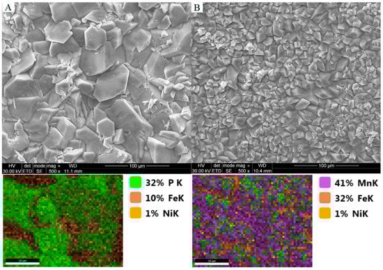 SEM images and EDX analysis of obtained coatings: (A) The manganese phosphating coating without the addition of manganese carbonate; (B) the manganese phosphating coating with the addition of manganese carbonate.