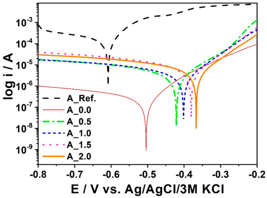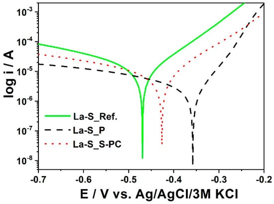 Polarization curves obtained for samples La-S_Ref, La-S_P, and La-S_PC.