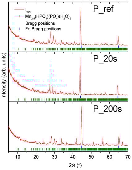 XRD patterns for the P_Ref, P_20s, and P_200s samples. Solid red lines are measured patterns, the green tickmarks correspond to Mn2.5(HPO4)(PO4)(H2O)2 phase, and the blue tickmarks correspond to iron.