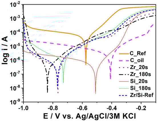 Polarization curves obtained of the Zr_20s, Si_20s, Zr_180s, Si_180s, Si_Ref, Zr_Ref, C_Ref, and C_Oil samples.