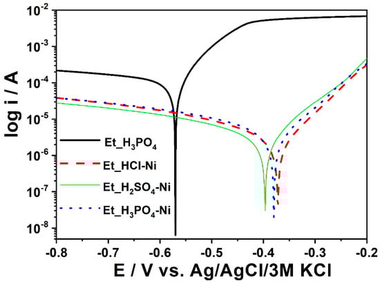 According to the results collected for the series of materials labeled as Et_H3PO4, Et_HCl-Ni, Et_H2SO4-Ni, and Et_H3PO4-Ni, see Figure 19, the sample Et_H3PO4-Ni exhibits the best anti-corrosive properties; that is, a less negative corrosion potential and quite a low corrosion rate.