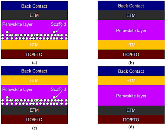 Different PSC device architecture (a) Inverted mesoscopic (p-i-n) device (b) Inverted planar (p-i-n) device (c) Mesoscopic (n-i-p) device (d) Planar (n-i-p) device.