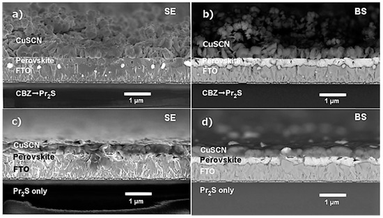 Scanning Electron Microscopy (SEM) cross-sectional images of FTO/c-TiO2/CH3NH3PbI3/CuSCN assemblies that were fabricated by doctor blading a solution of CuSCN in dipropyl sulfide (a,b) on a chlorobenzene pre-wetted perovskite layer (CBZ→Pr2S) and (c,d) on a dry perovskite layer (Pr2S only). SE: secondary electron images; BS: backscattered electron images. Reproduced with permission from Reference [49]. Elsevier 2017.