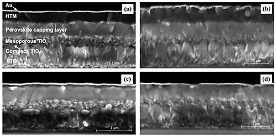 (a) SEM cross-section of spiro-OMeTAD-based HTM; (b) SEM cross-section of HTM deposited by doctor-blade technique; (c) SEM cross-section of HTM deposited by spin-coating technique; (d) SEM cross-section of PSC without HTM. Reproduced with permission from Reference [44]. American Chemical Society 2016.