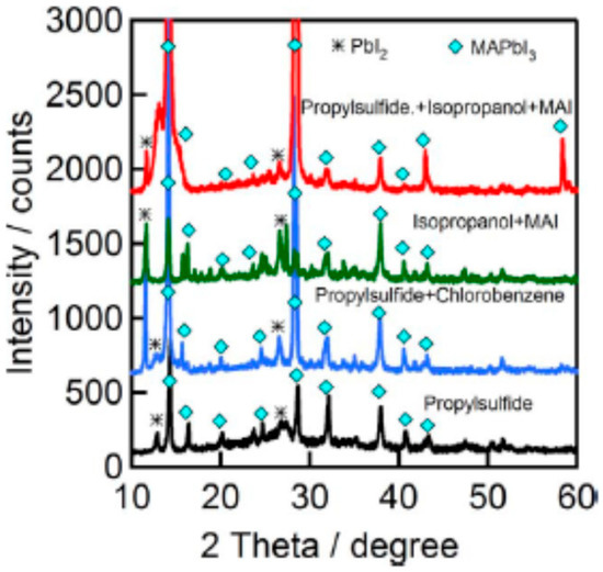 Murugadoss et al. [53] found that the XRD peak due to PbI2 was of low intensity for S1 and higher for other solvents, as illustrated in Figure 6. Figure 6 shows PbI2 peaks of higher intensities for S2 and S3. This signified the high dissolution/decomposition rates of the perovskite structure in the presence of other solvents. Hence, the resulting efficiency of the fabricated PSCs was lower as shown in Table 1. Table 2 gives a summary of different solvents, methods and fabrication conditions used in the fabrication of CuSCN thin films.
