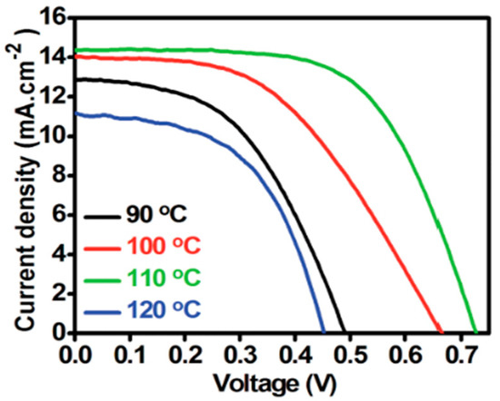 J-V curve of solar cells annealed at different temperatures under illumination of 100 mWcm−2 simulated sun irradiation (1.5 AM). Reproduced with permission from Reference [69]. Royal Society of Chemistry 2014.