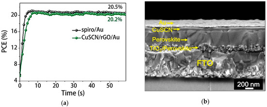 Arora and associates also gave an insight on issues of instability in CuSCN-based PSCs. In their work, they introduced a thin spacer layer of reduced graphene oxide (rGO) using spin coating before depositing the Au layer with a resulting overall structure: FTO/compact TiO2/mesoporous TiO2/CsFAMAPbI3−xBrx/CuSCN/rGO/Au, the SEM cross-sectional micrograph is shown in Figure 8. Figure 8 also shows the maximum power point tracking for 60 s which yielded a stabilized efficiency of spiro-OMeTAD and CuSCN PSCs devices.