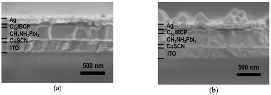 In 2015, Ye et al. [72] reported on CuSCN-based inverted planar perovskite solar cell. Deposition of CuSCN was carried via a one-step deposition for device A, while two-step sequential deposition process was used for device B. Figure 9 shows the SEM cross-sectional images of the two devices and Table 4 presents the respective photovoltaic performance parameters. Device B was found to degrade rapidly due to percolation of air and moisture to the perovskite layer.