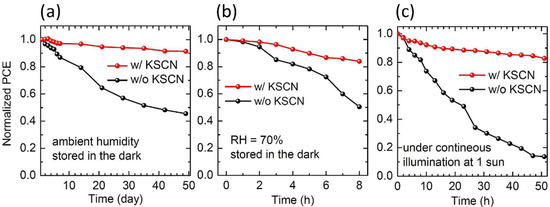 Time-dependent PCE of PSCs depending on post-treatment with KSCN at different condition of (a) ambient atmosphere with low humidity (the devices kept in the vacuum chamber in the dark before and after measurements), (b) relative humidity (RH) of 70% and (c) continuous illumination under one sun (the devices were encapsulated). Reproduced with permission from Reference [76]. Elsevier 2019.