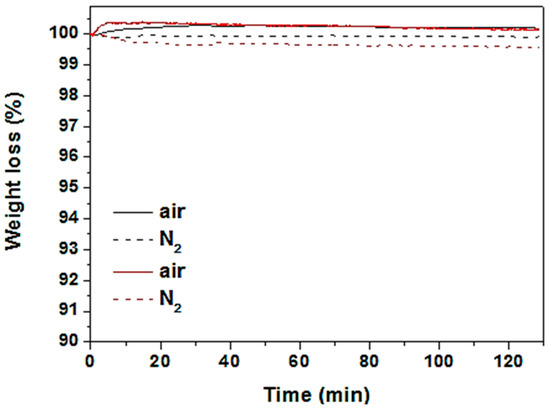 Jung et al. [75] tested the intrinsic thermal stability of CuSCN and spiro-OMeTAD materials using thermogravimetric analysis (TGA). There was relatively no observed weight loss for both samples exposed to air or nitrogen at 125 °C for 2 h as shown in Figure 11. They went on to investigate the thermal stability of CuSCN-based PSC at 125 °C for 120 min in air at 40% relative humidity in the dark. The CuSCN-based PSC managed to retain more than 60% of its initial efficiency while the spiro-OMeTAD-based control PSC had a dramatic efficiency reduction from 18.4% to 4.6%.